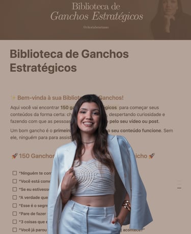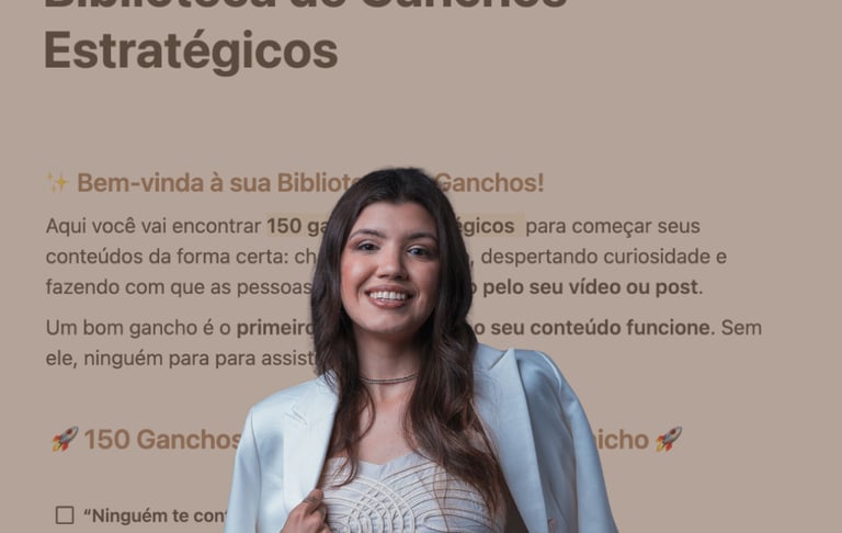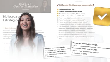 São 150 ganchos prontos, 30 CTAs, 15 prompts inteligentes + uma pesquisa para você fazer com sua IA e um guia de como fazer esse sistema se tornar infinito, pra você nunca mais travar na hora de criar. Todo esse sistema dentro de um Notion onde você poderá ter acesso vitalício. Além disso, + de 100 templates profissionais feitos no Canva para você já começar a utilizar.