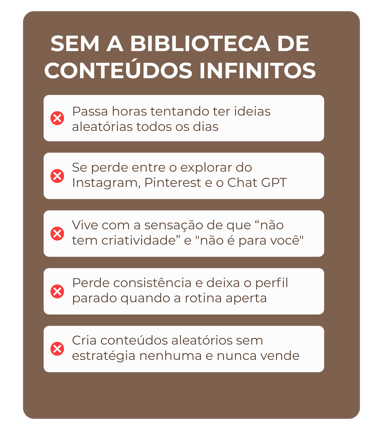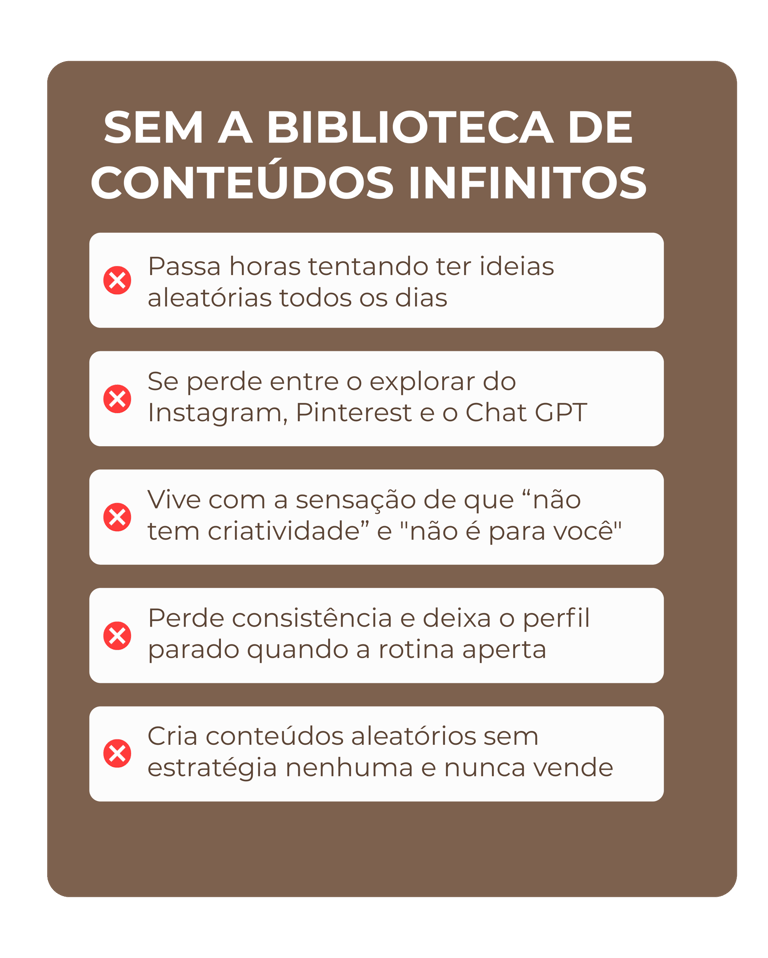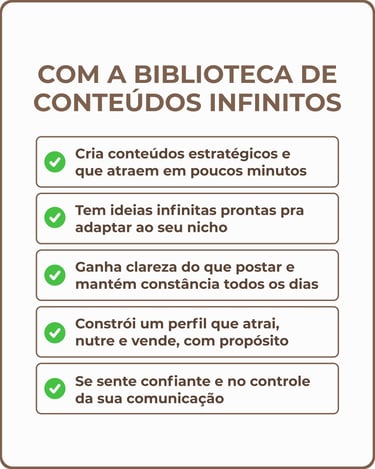 Não importa qual é o seu negócio ou o seu nicho, a Biblioteca de Conteúdos Infinitos é a ferramenta que te entrega tudo o que você precisa pra criar conteúdos estratégicos em minutos.