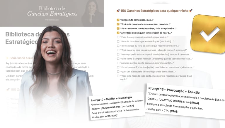 O sistema completo que simplifica a sua criação de conteúdo e te faz vender mais através de GANCHOS, ESTRUTURAS, CTAs, PROMPTS infinitos e TEMPLATES profissionais.